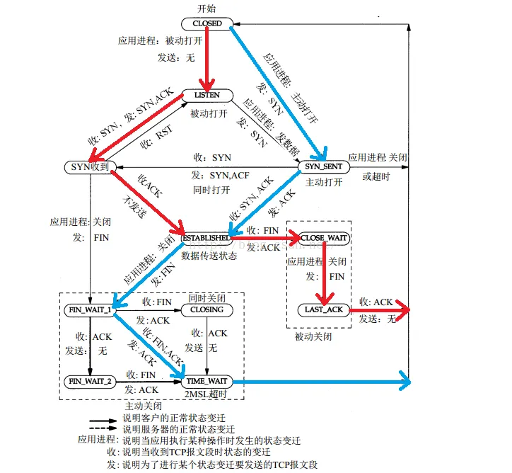 在一个TCP连接的生命周期内,每个主机上的TCP协议都有不同的状态,这种状态叫TCP状态。如图说明了一系列典型的TCP状态以及之间的变迁过程。