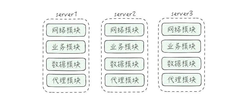 当我们有多台服务器,每一台服务器都单独运行一个完整的server时,靠着数量的累计,用户的并发量将会提升,但是单个服务器上的问题并没有解决。