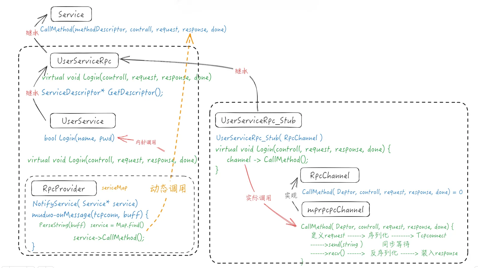 根据上面的代码,整理成如下图所示的调用关系图,其中展示了mprpc中主要的类和函数以及它们之间的关系: