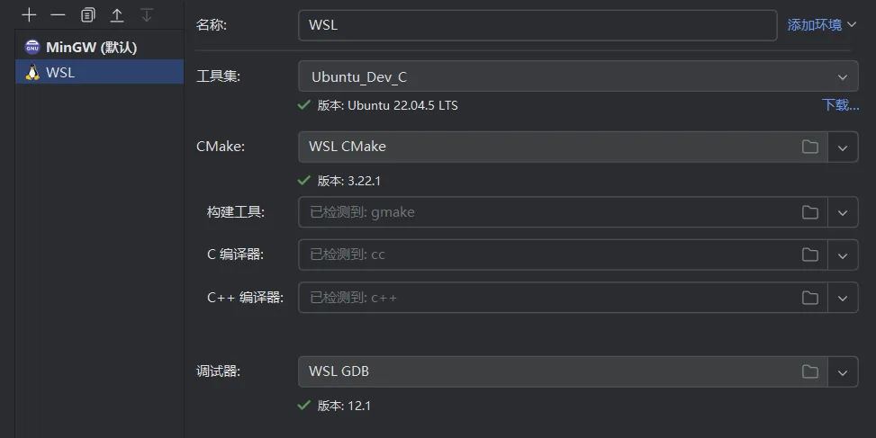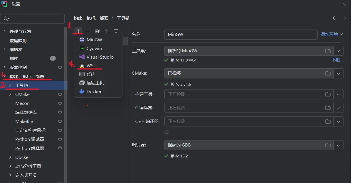 进入【设置】 -> 选择【构建执行部署】 -> 选择【工具链】 -> 点击【+】 -> 选择【WSL】