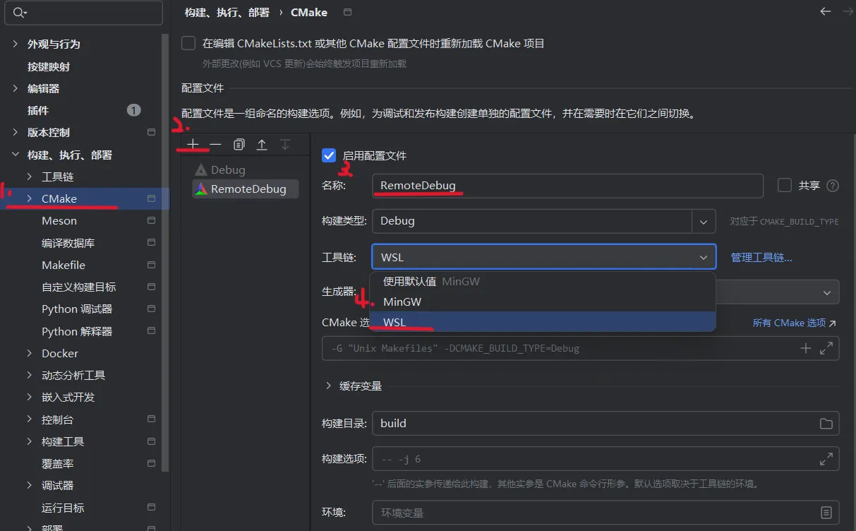 【构建执行部署】下 -> 选择【CMake】 -> 点击【+】 -> 修改【名称】 -> 点击【工具链】 -> 选择【WSL】 -> 其他选项按照个人爱好和习惯选择:例如构建目录我会修改为build。